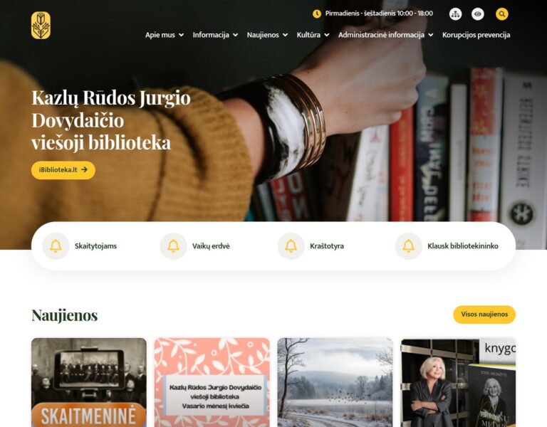 Concebemos e desenvolvemos um website moderno para a Biblioteca Pública de Kazlų Rūda, de forma a tornar os seus serviços, eventos e recursos mais fáceis de aceder online. O projeto apoia o papel da biblioteca como centro cultural e educativo, proporcionando aos residentes uma experiência digital clara e inclusiva.