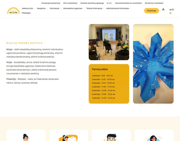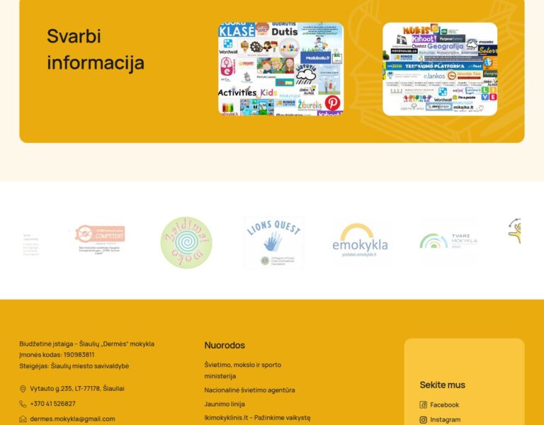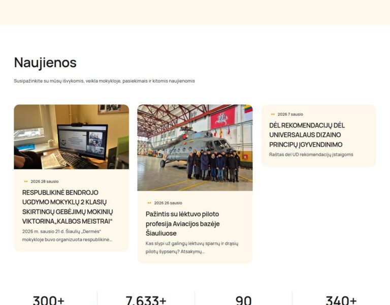 Concebemos e desenvolvemos um website moderno para a Escola Šiauliai Dermės, de forma a apresentar a vida escolar online de modo claro e acessível. A plataforma ajuda alunos, pais e pessoal docente a encontrar informação importante, acompanhar as notícias da escola e manter-se ligados à comunidade escolar alargada.