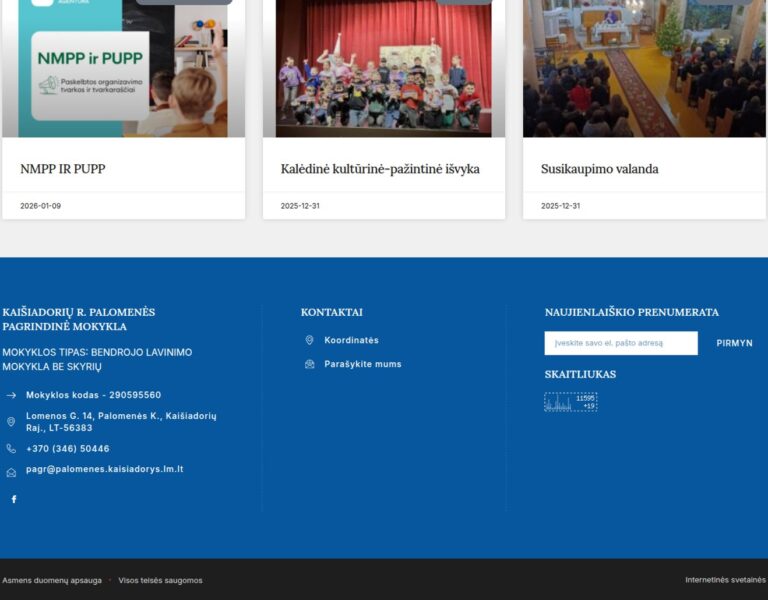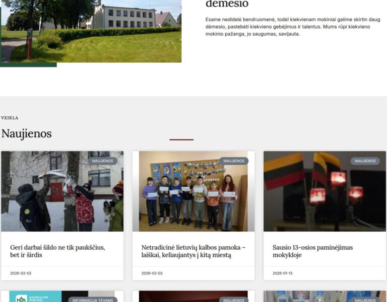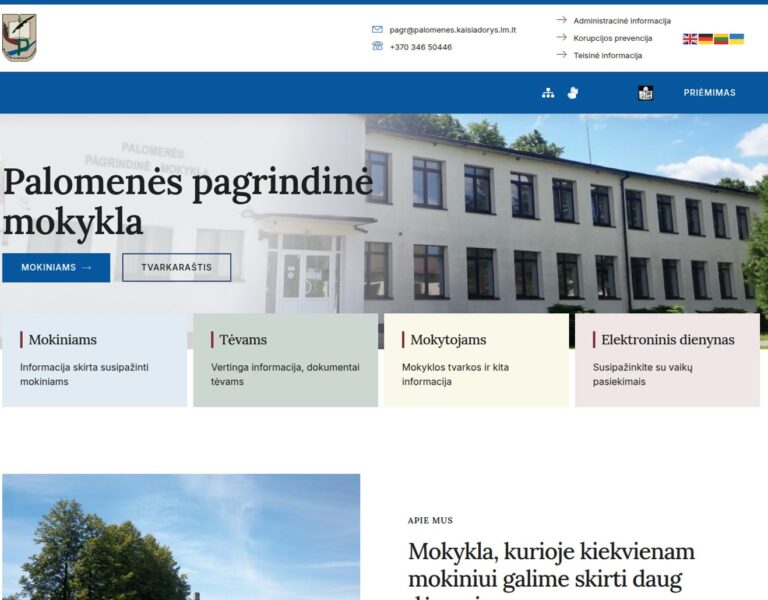 Concebemos e desenvolvemos um novo website para a Escola Primária de Palomenė, no distrito de Kaišiadorys, para tornar a informação essencial mais fácil de consultar por alunos, pais e pessoal docente. O resultado é uma presença digital clara e acolhedora, que apoia a comunicação do dia a dia e reforça a ligação da escola à sua comunidade.