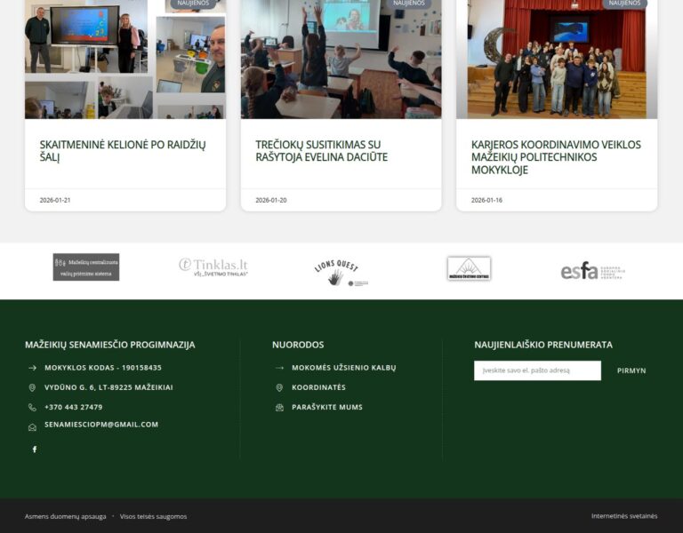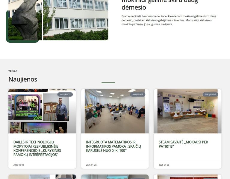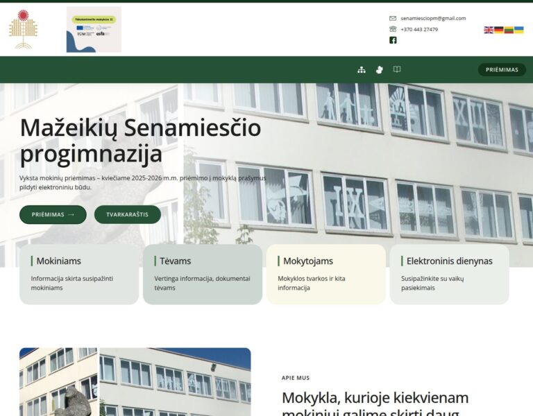 Criámos um website contemporâneo para o Mažeikiai Old Town Progymnasium, que apresenta a escola de forma clara a alunos, pais e à comunidade em geral. A nova plataforma apoia a comunicação diária e reflete a abordagem inovadora da escola em relação à educação.