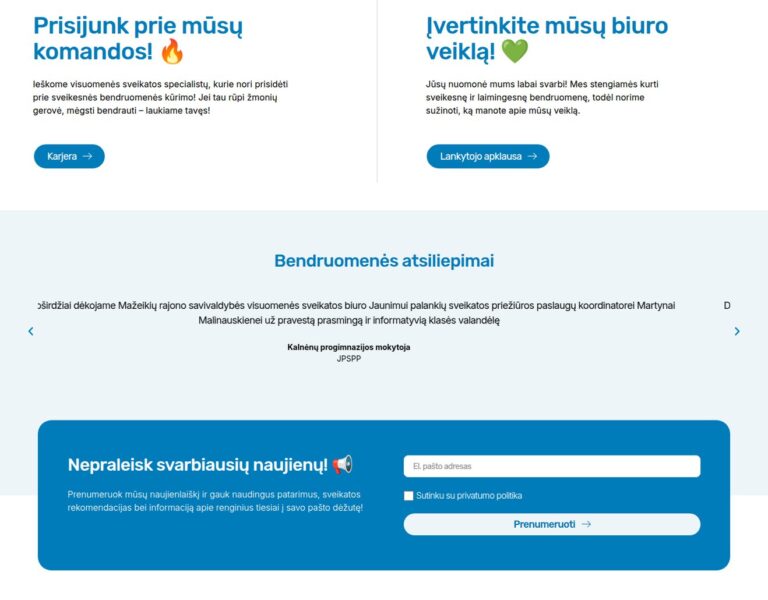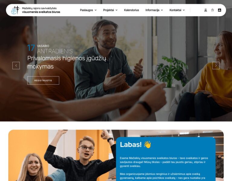 Criámos um website moderno para o Gabinete de Saúde Pública de Mažeikiai, para tornar mais fácil o acesso a informações de saúde, notícias e atividades comunitárias. A plataforma apoia a missão de saúde pública da organização, ajudando os residentes a encontrar orientações fiáveis e a manter-se informados sobre iniciativas locais.