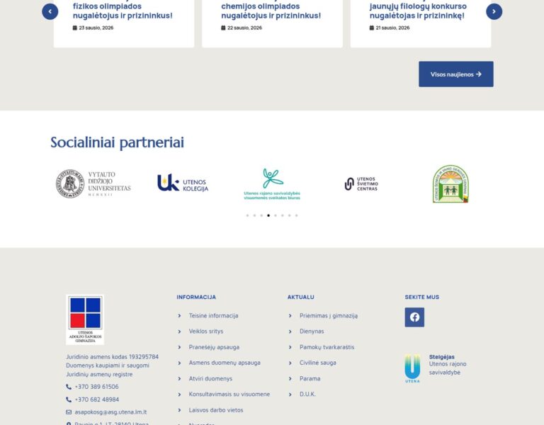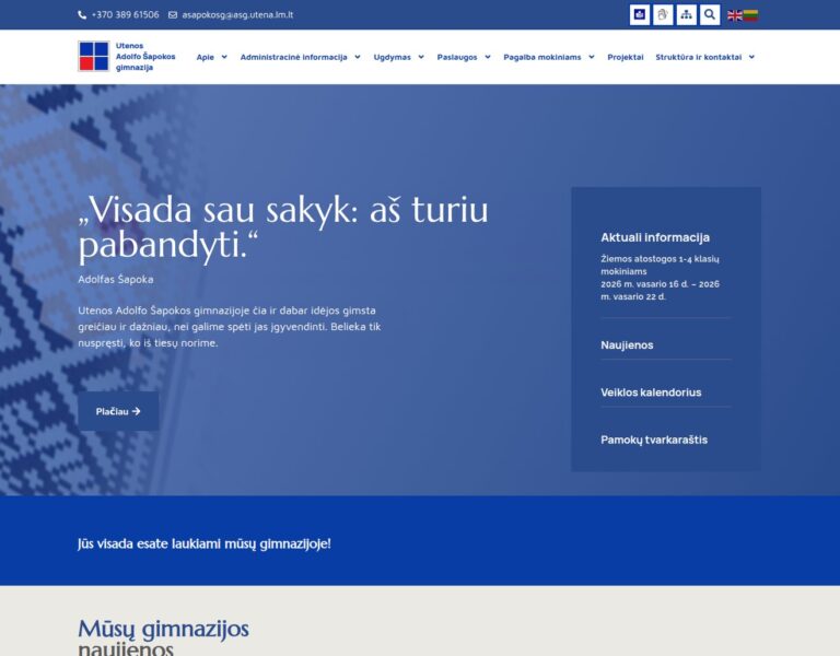 Concebemos e desenvolvemos um website moderno para o Liceu Utena Adolfo Šapokas, de forma a apresentar a escola de modo claro a alunos, pais e à comunidade em geral. A nova plataforma melhora o acesso a informações essenciais e apoia a comunicação quotidiana de uma forma mais estruturada e intuitiva.